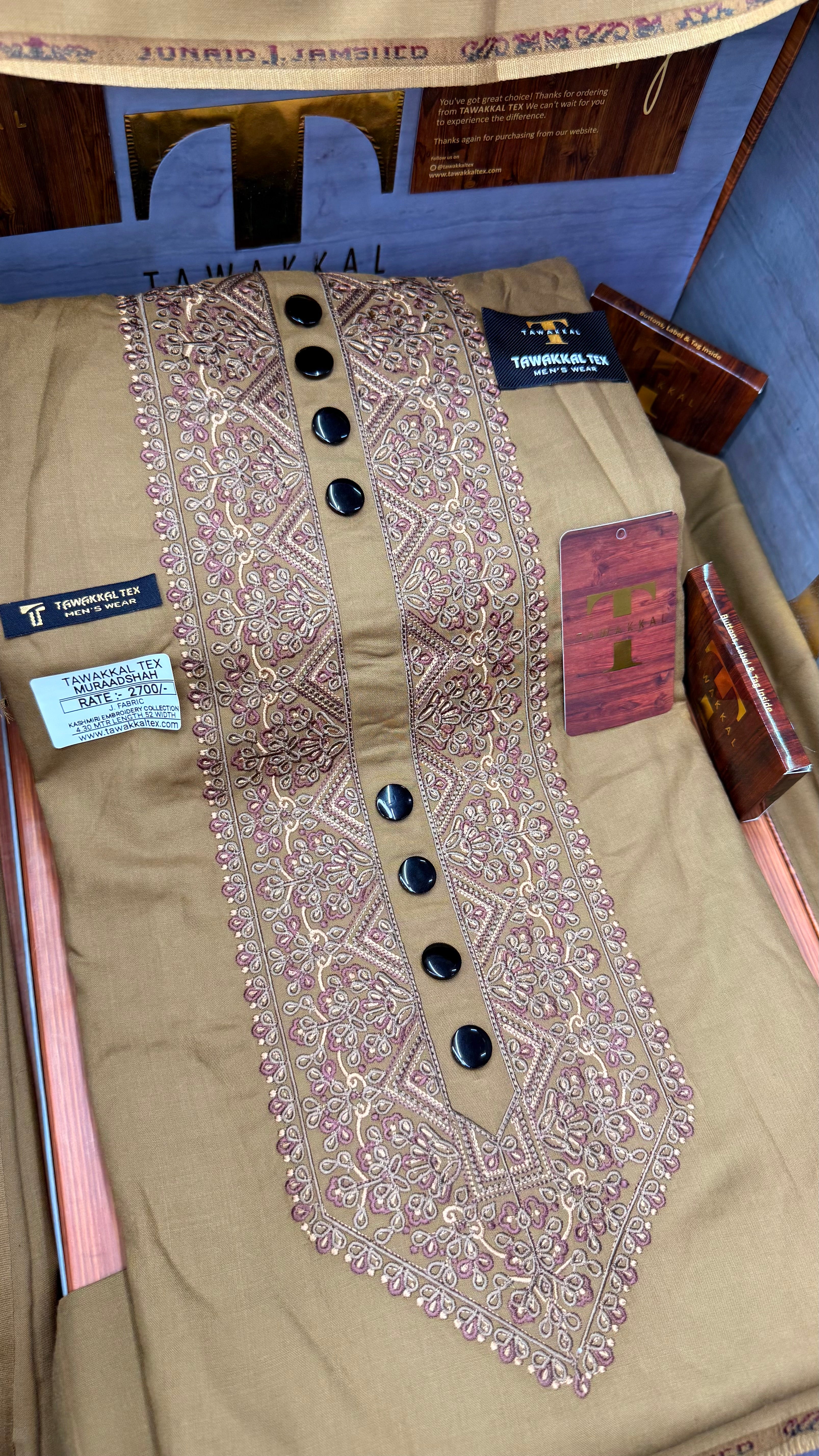 Introducing the exquisite MURAADSHAH a masterpiece showcasing multi-colour Kashmiri embroidery. This unstitched full Kurta Salwar Pathani set is crafted from premium imported J. fabric, offering both elegance and comfort. Perfect for traditional occasions, its intricate designs reflect the rich heritage of Kashmiri artistry. (J. Fabrics) Multi Coloured Kashmiri Embroidery Kurta from Tawakkal. The intricate embroidery reflects the rich cultural heritage, making it a perfect choice for special occasions and festive wear.