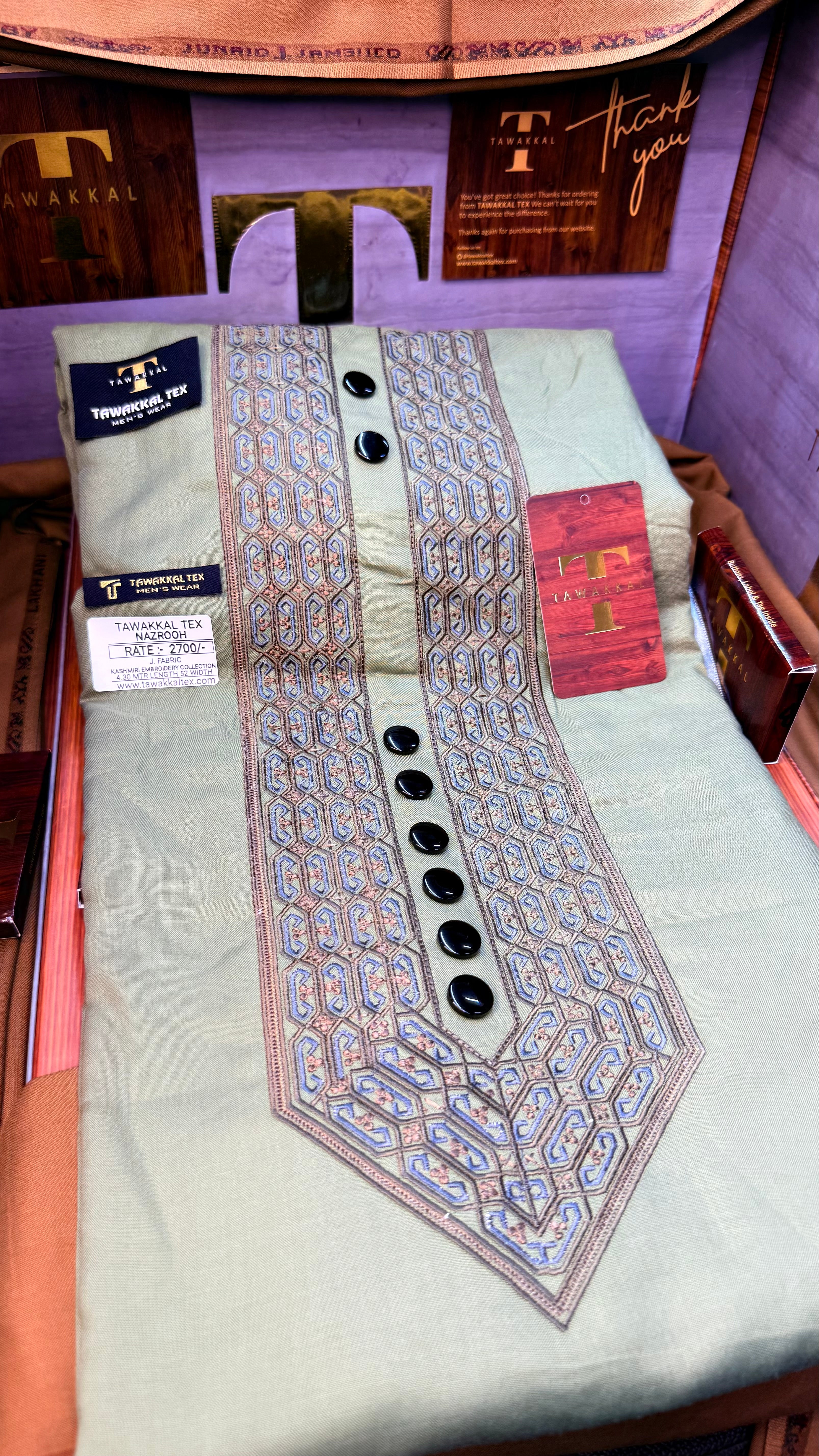 102-07 OLIVE GROVE MULTI COLOUR KASHMIRI EMBROIDERY UNSTICHED FULL KURTA SALWAR PATHANI Tawakkal Tex”